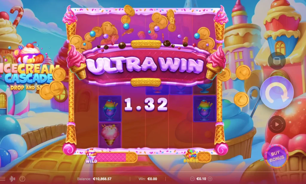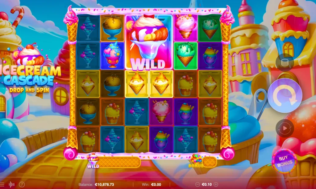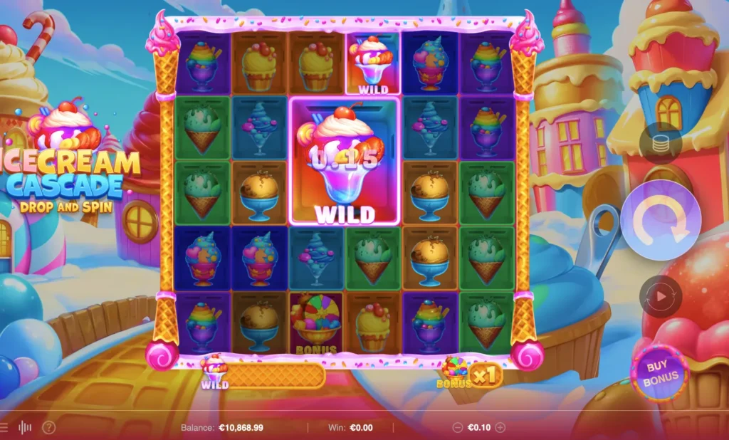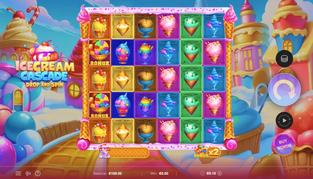 Ice Cream Cascade is a 6x5 slot Cascading Reels with cluster Pays (5+ adjacent matching symbols), with a Ice Cream refresher, Progress your wins to earn BIG WILDS with amazing wins, and an exiting Bons wheel of delicious big multiplier wins
