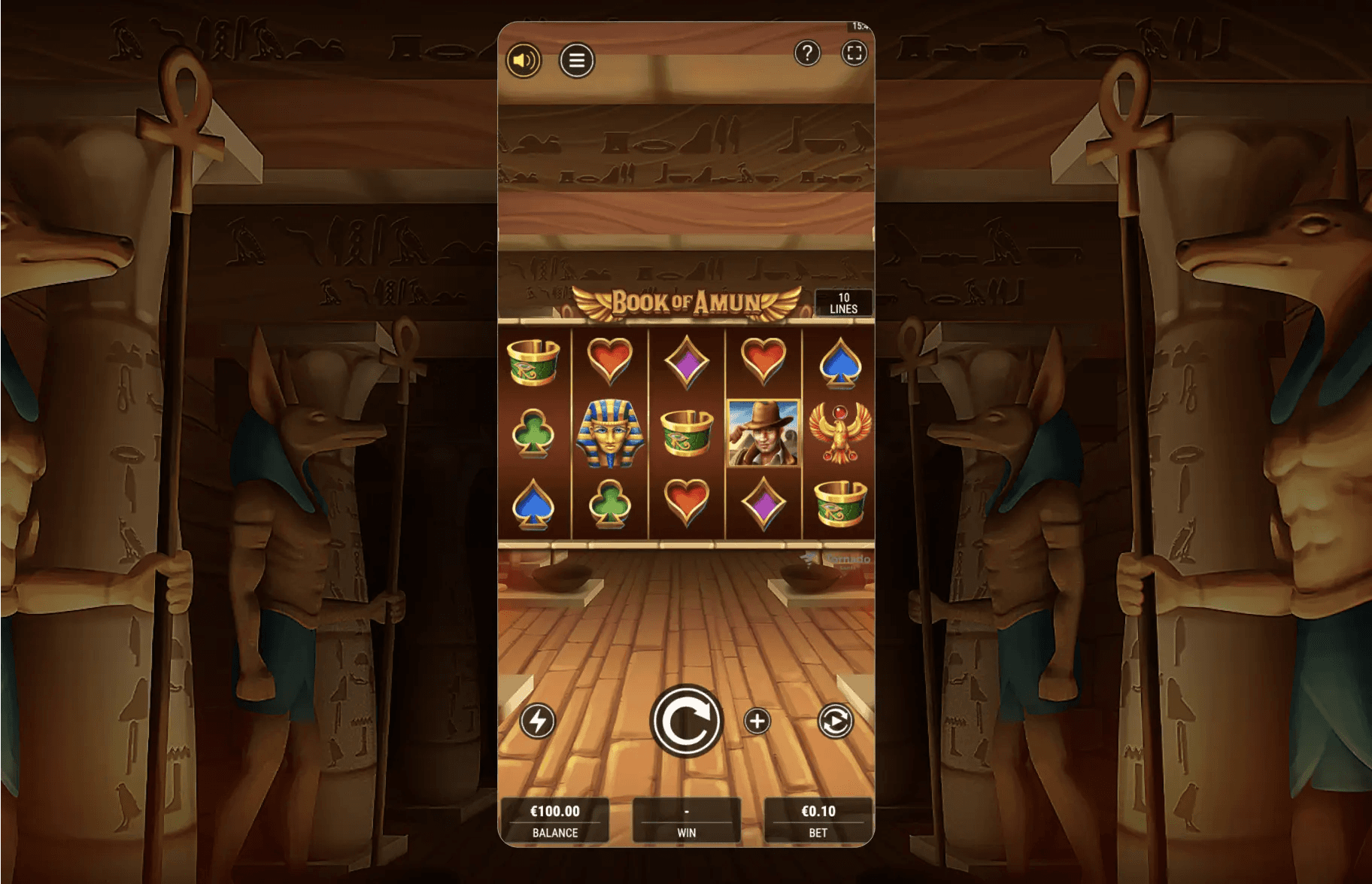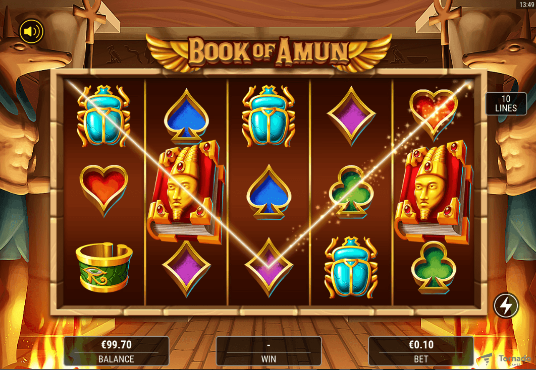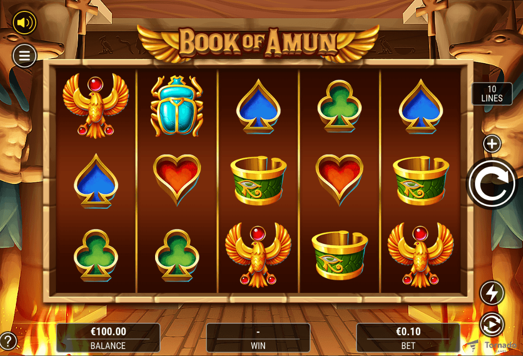 Book of Amun is a 5x3 video slot with 10 fixed paylines and classic book-style mechanics. The Book symbol acts as both Wild and Scatter, triggering 10 Free Games when 3 or more appear. A Bonus Symbol is randomly selected at the start of the Free Spins. This symbol can expand vertically across reels, paying on all positions and delivering powerful win potential across every spin.