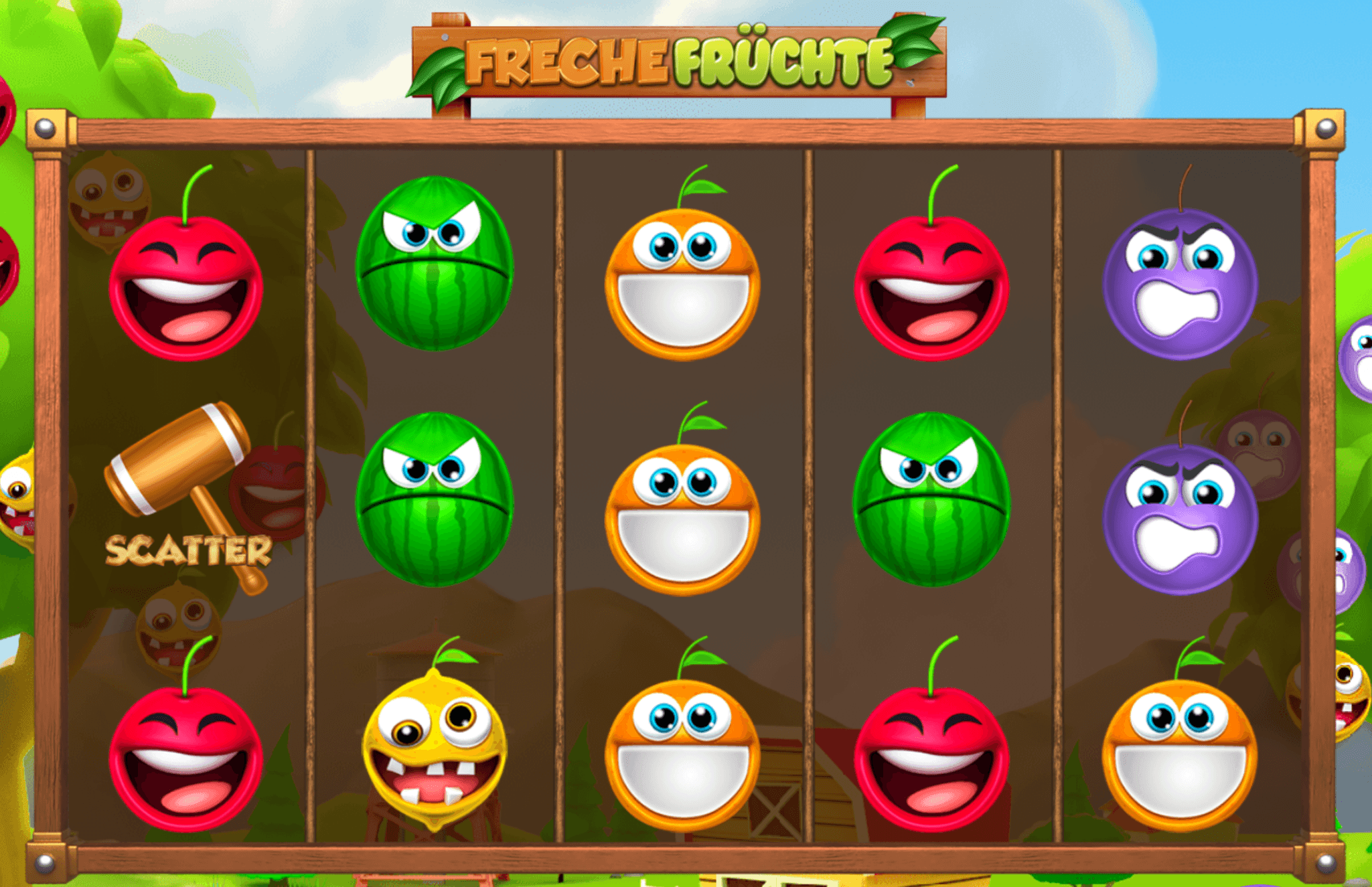 Freche Früchte is a video slot machine with 5 reels and 3 rows. The game is played with 11 unchangeable pay lines. All wins are counted from left, center and right on consecutive reels. Only the highest win per pay line is counted. All wins on the pay lines add up. The tree is a wild symbol and substitutes for all symbols except the hammer. The hammer is a scatter symbol and is counted independently of the lines. Winning amount is determined by the number of identical symbols in the pay table.
